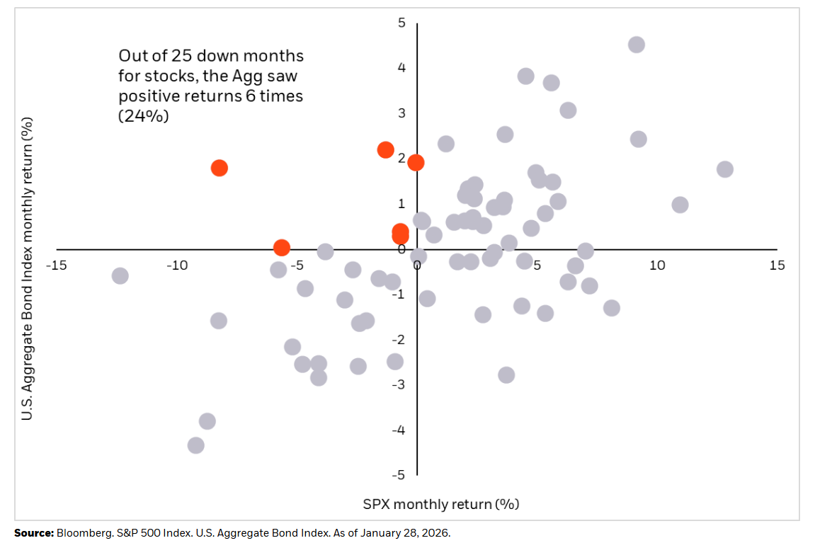 她说:“自2020年以来,在标普500指数单月跌幅超过5%的月份中,黄金平均回报率达到2%,而美国综合债券指数的表现则几乎持平。这种不对称性使黄金在市场回撤情景中显得格外有价值。”
