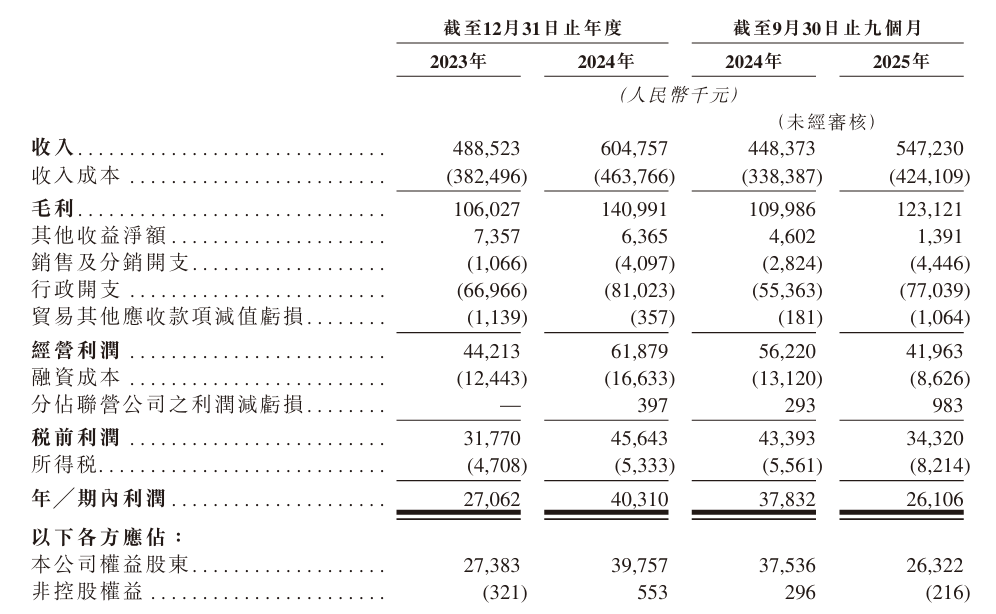 毛利同步增长,从2023年的1.06亿元增至2024年的1.41亿元,2025年前九个月毛利为1.23亿元,同比增长11.9%。毛利率从2023年的21.7%提升至2024年的23.3%,2025年前九个月略有回落至22.5%,整体保持稳定。
