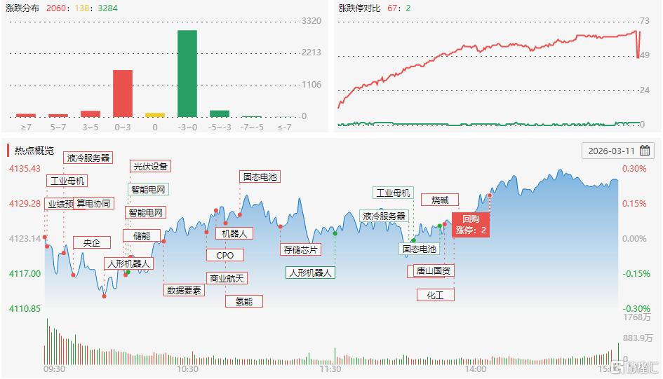 3月11日,A股主要指数继续上涨,沪指涨0.25%报4133点,深证成指涨0.78%,创业板指涨1.31%。沪深两市成交额2.51万亿,较上一个交易日放量1105亿。全市场超3200只个股下跌。