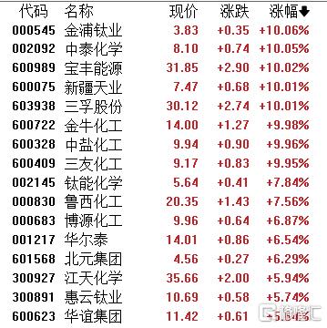 化学原料板块领涨,金浦钛业、中泰化学、宝丰能源、新疆天业、三孚股份、金牛化工等多股涨停。