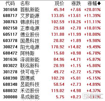 电池板块强势,武汉蓝电涨超21%,中一科技、德福科技、天赐材料、海科新源、鹏辉能源、亿纬锂能等多股跟涨。