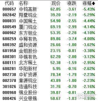 小金属板块低迷,中钨高新、翔鹭钨业跌超5%,中国稀土、厦门钨业、东方钽业、中稀有色、盛和资源等跟跌。