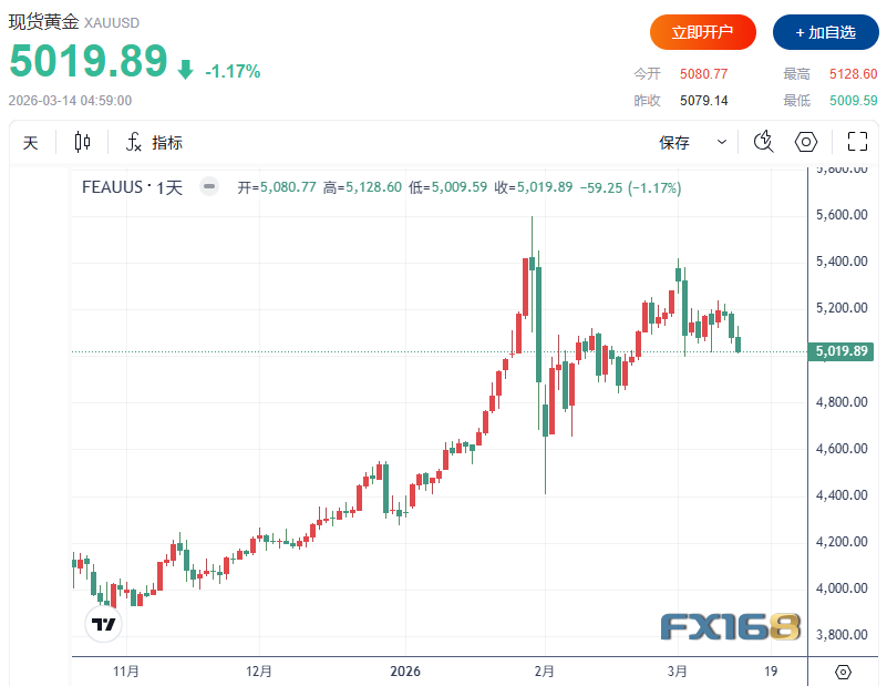 黄金市场本周继续承压,现货金价格测试5000美元上方支撑。周五(3月13日),现货黄金收报5019.89美元/盎司,下跌59.25美元,跌幅1.17%。本周,现货黄金下跌151.65美元,跌幅2.93%。