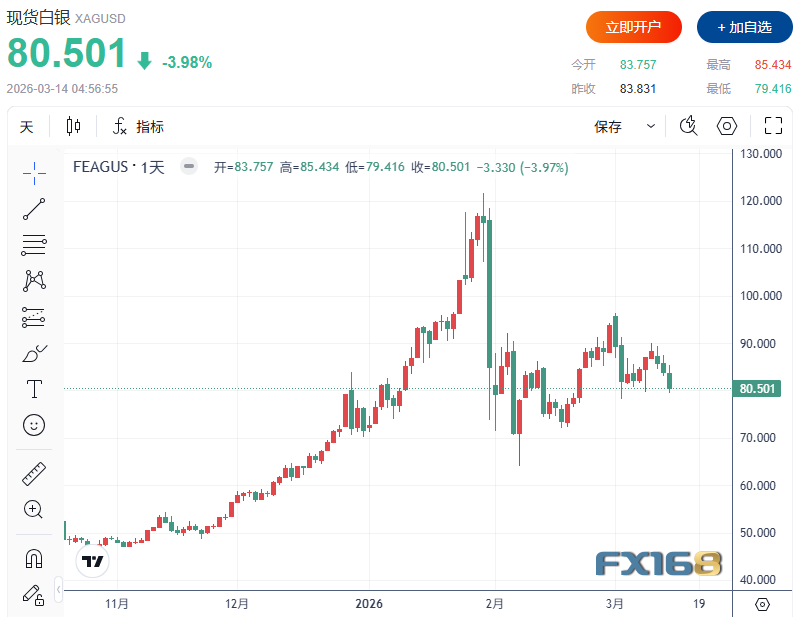 白银走势也较为类似,价格正在测试81美元附近支撑,现货白银收报80.501美元/盎司,下跌近4%。