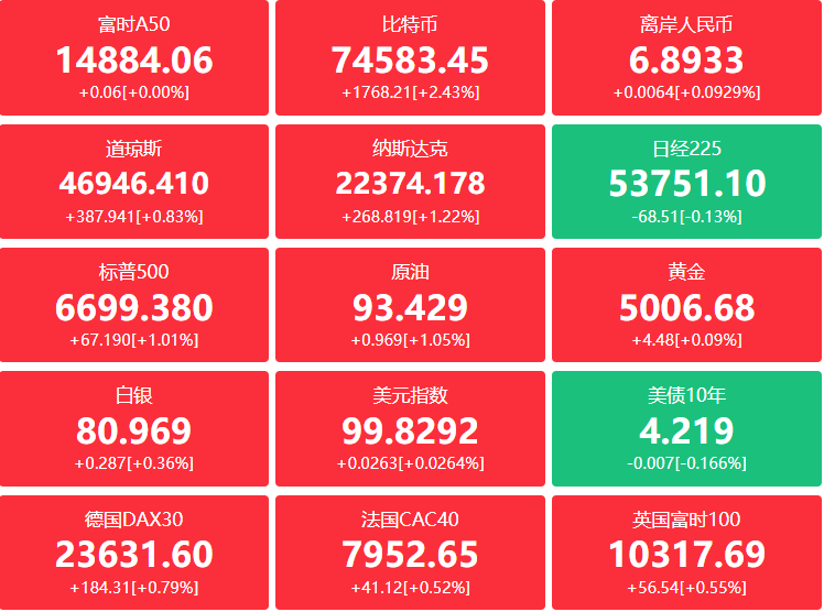 外盘:投资者关注伊朗战争最新进展,同时原油价格大幅回落,美股集体收涨,其中道指涨387.94点,涨幅0.83%报46946.41点;纳指涨268.82点,涨幅1.22%报22374.18点;标普500上涨67.19点,涨幅为1.01%报6699.38点;存储芯片股普涨,闪迪涨超6%,西部数据涨超5%,美光科技涨超3%;阿斯麦涨超2%,英伟达涨超1%;中概股龙头指数收涨1.16%。腾讯音乐涨超6%,富途控股涨超5%,理想汽车涨超5%,蔚来涨超3%。