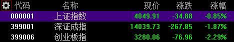 A股三大指数今日高开低走,尾盘集体下挫,截至收盘,沪指跌0.85%报4049点,深证成指跌1.87%,创业板指跌2.29%。全市场成交额2.22万亿元,较前一交易日缩量1153亿元,超4500股下跌。