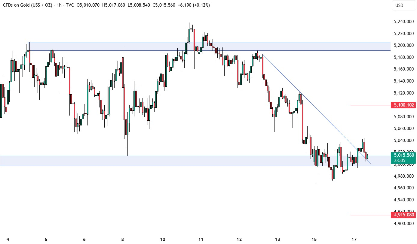 从4小时图来看,可以更清楚地看到金价目前维持在5,000美元支撑位与5,200美元阻力位之间震荡整理。此次价格虽曾短暂跌破支撑,但最终重新回到区间内。市场参与者预计仍将延续区间操作思路,即在支撑位附近买入、在阻力位附近卖出,直到价格向任一方向出现明确突破。