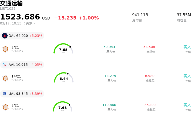 Delta Air Lines Inc (DAL) 盘中上涨5.23%, 所属行业交通运输上涨1.00% ,公司涨幅跑赢行业涨幅,行业成交额前三股票 Delta Air Lines Inc (DAL) 上涨 5.23%;American Airlines Group Inc (AAL) 上涨 4.05%;联合航空 (UAL) 上涨 3.39%。
