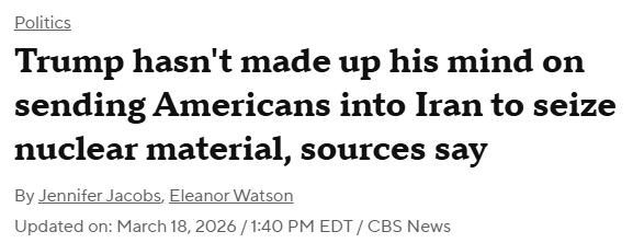 FX168财经报社(北美)讯 随着美伊冲突持续升级,美国总统特朗普是否进一步扩大军事行动,正成为市场与外交层面最受关注的焦点。多家媒体最新披露,特朗普尚未决定是否派遣美军进入伊朗境内,夺取该国高浓缩铀等核材料;与此同时,美方正向中东增派约2500名海军陆战队,外界普遍认为,这意味着美国已在为更复杂、风险更高的下一阶段行动做准备。