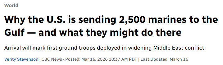 与此同时,CBC News报道称,美国正向中东部署约2500名海军陆战队,这是自2月28日美以对伊朗发动行动以来,首批正式增派到该地区的美军地面部队。分析人士认为,这支快速反应部队未来最可能的任务,是协助重开霍尔木兹海峡,包括控制靠近航道的小型岛屿、部署防空系统、配合海军护航以及实施更广泛的空中与网络支援。