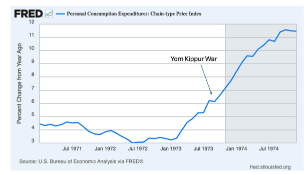 他进一步指出,很多人可能并没有意识到,1973年石油冲击之所以会对美国经济造成如此剧烈的影响,一个重要原因在于:在赎罪日战争引发阿拉伯国家石油禁运、从而触发第一次石油危机之前,美国国内通胀其实就已经在快速上升。