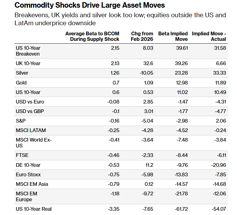 为了衡量伊朗冲突可能引发的市场波动,分析四次历史性大宗商品供给冲击中,资产价格与商品价格之间的关系。按照当前彭博商品指数(BCOM)的涨幅来看,这些贝塔值所暗示的资产调整幅度,明显大于目前市场已经计入的程度。