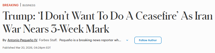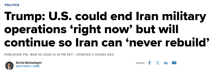 FX168财经报社(北美)讯 美国总统特朗普周五(3月20日)连续释放对伊最强硬信号,不仅明确表示无意推动停火,还称美国虽然“现在就可以结束”对伊军事行动,但那并不是可以接受的结果,因为伊朗仍有可能在未来10年内重建军事能力;而如果美方继续军事打击更长时间,伊朗将“永远无法重建”。这一表态显示,已持续近三周的美以对伊战争短期内恐难降温,也令市场进一步押注中东冲突将走向长期化与更深层次升级。