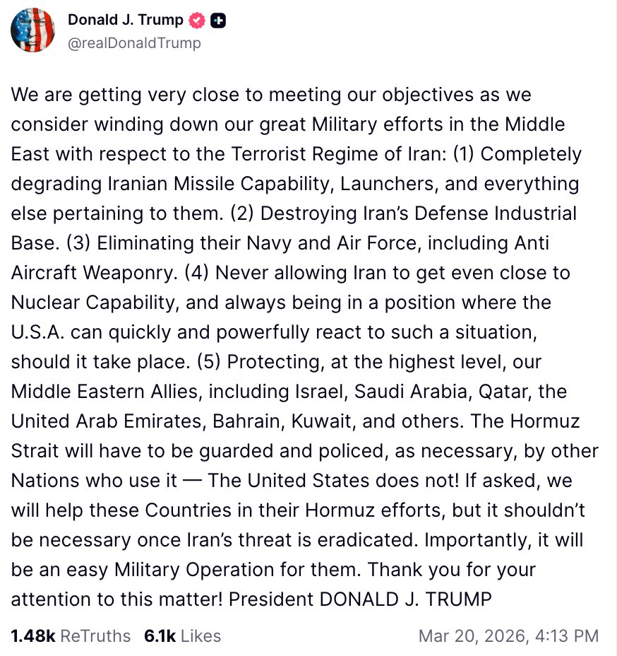 特朗普在其社交媒体Truth Social上发文称,随着他们考虑逐步降级在中东针对伊朗政权所开展的各项重大军事行动,他们已“非常接近”实现既定目标: