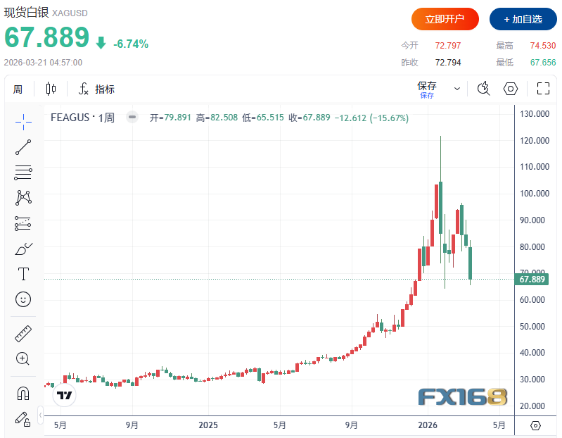 相比之下,白银跌势更为剧烈。本周银价势将累计下挫15.67%,创下今年1月冲高回落以来最大跌幅。现货白银收报67.889美元/盎司,日内大跌6.74%。