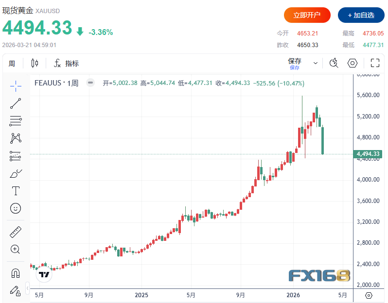 黄金本周累计下跌525.56美元,跌幅达10.47%,创下1983年以来最大单周跌幅。自战争爆发以来,金价累计跌幅已超过14%。近期市场数据显示,金价一度跌破4500美元,而年内高点曾升至5600美元上方。