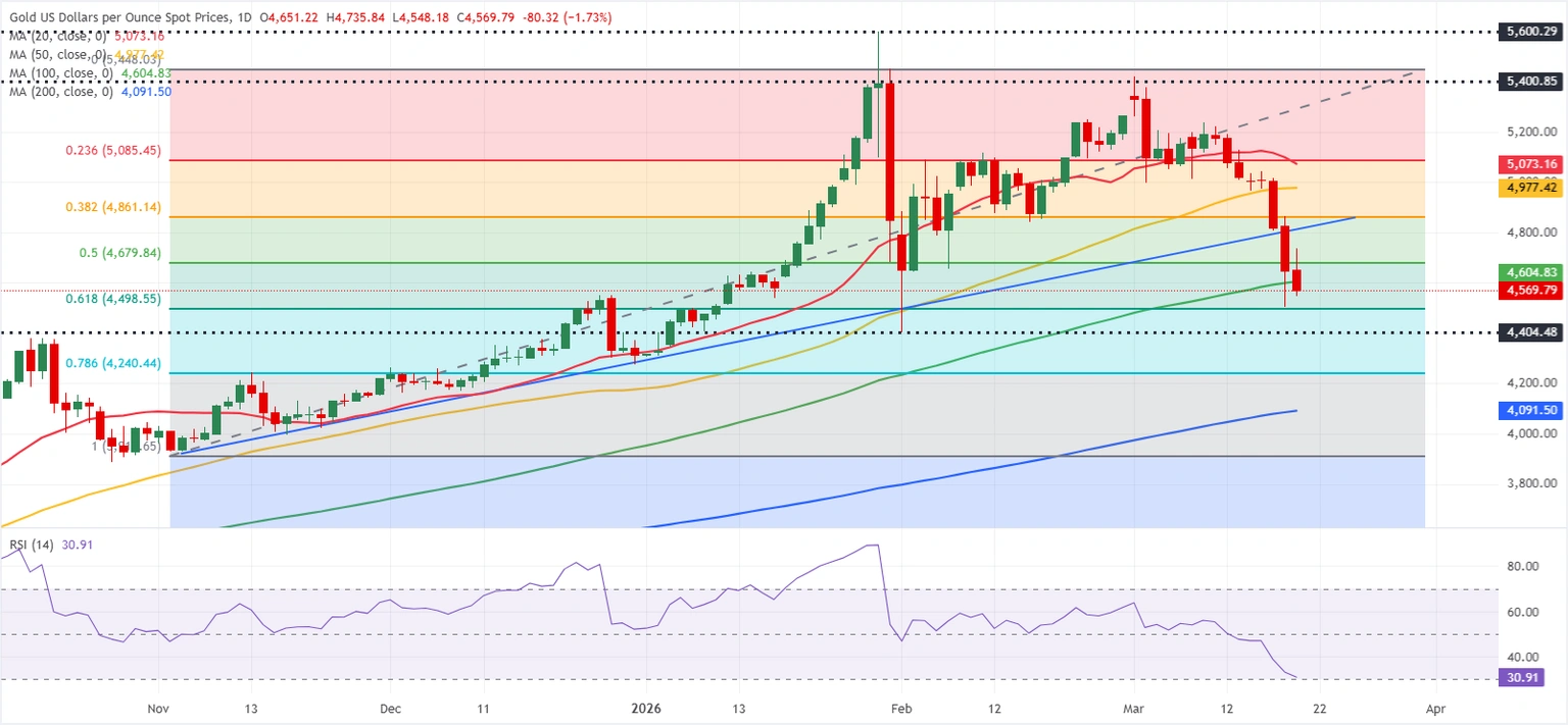 当前100日均线位于4600美元附近,构成短线关键枢轴位,其下方首个重要支撑在4500美元,即去年11月至今年2月这轮上涨行情的61.8%斐波那契回撤位。若金价日线有效跌破这一位置,可能吸引更多技术性卖盘入场。在这种情况下,4400美元将成为下一道临时支撑,之后更下方目标可能指向4240美元附近,对应78.6%斐波那契回撤位。