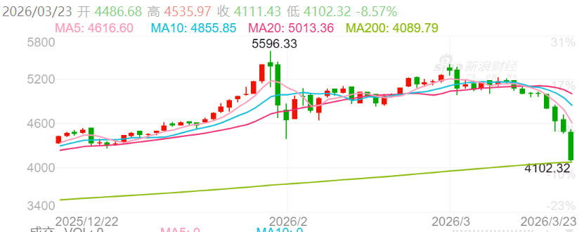 周一(3月23日)金价在连续八个交易日收跌后进一步崩溃,日内暴跌超300美元,最低触及4114.71美元,较日内高点4535美元跌逾400美元。