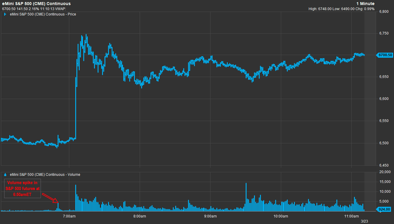 FX168财经报社(北美)讯 美国总统特朗普周一(3月23日)发布有关美伊接触及暂缓打击伊朗能源基础设施的声明后,全球市场迅速剧烈波动:标普500指数期货盘前一度飙升逾2.5%,WTI原油期货则重挫近6%。然而,更引发交易员关注的是,在特朗普发出这则足以撼动市场的帖文前约15分钟,美股股指期货与原油期货已先后出现明显异常放量,令这一敏感时点的交易行为迅速成为市场焦点。有关特朗普推迟对伊朗能源设施打击的表态,以及此后风险资产大涨、油价急跌的走势,已被多家媒体广泛报道。