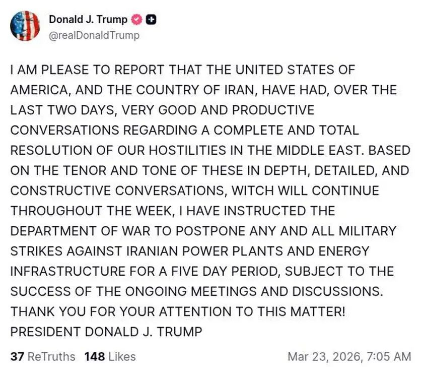 特朗普一句话引爆全球定价,市场对“最坏情境延后”迅速重估从更广的市场背景来看,特朗普当天的表态本身就足以成为重大价格触发器。此前,美国总统曾就霍尔木兹海峡问题向伊朗发出强硬警告,市场担忧美方可能直接打击伊朗能源与电力系统,从而进一步推高原油价格并拖累全球风险偏好。特朗普随后改口称,将把针对伊朗能源基础设施的打击推迟5天,并表示美伊之间进行了“非常好且富有成效”的沟通,尽管伊朗方面否认存在直接接触。