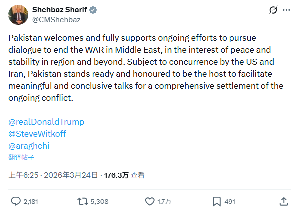 巴基斯坦总理谢里夫周二在X平台发文称,巴基斯坦欢迎并全力支持通过对话结束中东战争的努力;在美伊双方同意的前提下,巴方“已准备好并深感荣幸”担任东道主,推动“有意义且具结论性”的会谈,以寻求对当前冲突的“全面解决”。谢里夫在帖文中还直接标注了特朗普、美国中东问题特使威特科夫以及伊朗外长阿拉格齐的社交账号。