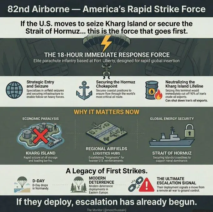 一张近期流传的军事示意图将美国陆军第82空降师称为“美国的快速打击力量”,并渲染称,如果美国决定夺取伊朗哈尔克岛(Kharg Island)或控制霍尔木兹海峡,那么这支部队将可能成为最先投入行动的力量。