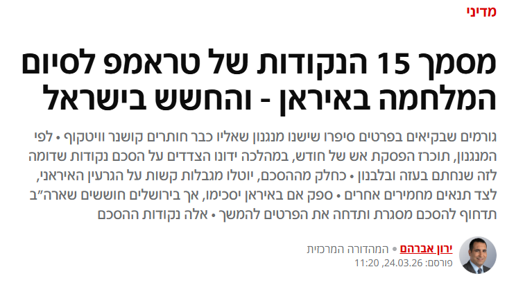 FX168财经报社(北美)讯 中东局势周二(3月24日)传出新的外交动向。以色列12频道和《纽约时报》等媒体报道称,美国与伊朗正酝酿建立一项为期一个月的停火机制,相关框架据称由美国中东问题特使威特科夫和库什纳推动,停火期间将围绕一项15点方案展开谈判,内容涉及伊朗核计划、弹道导弹项目以及海上通道安排。
