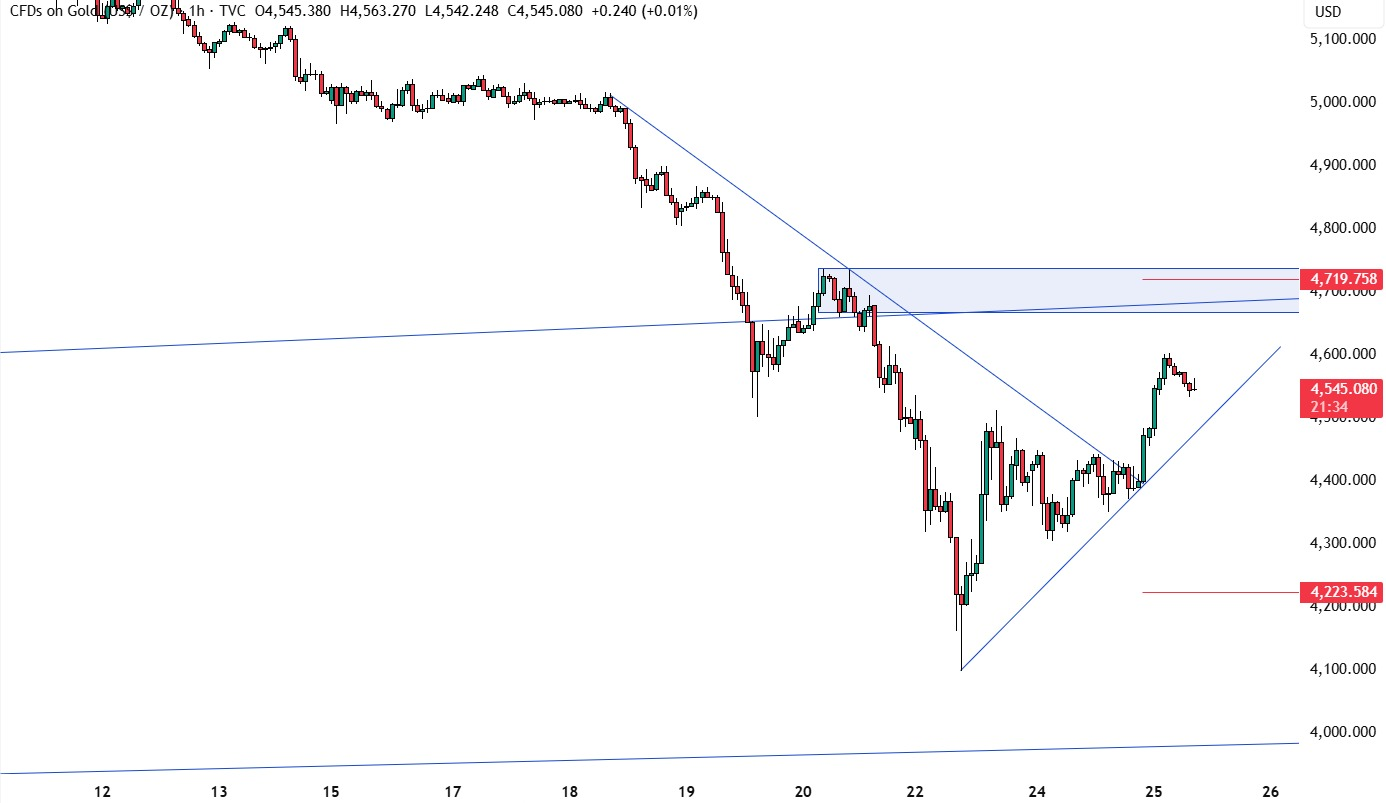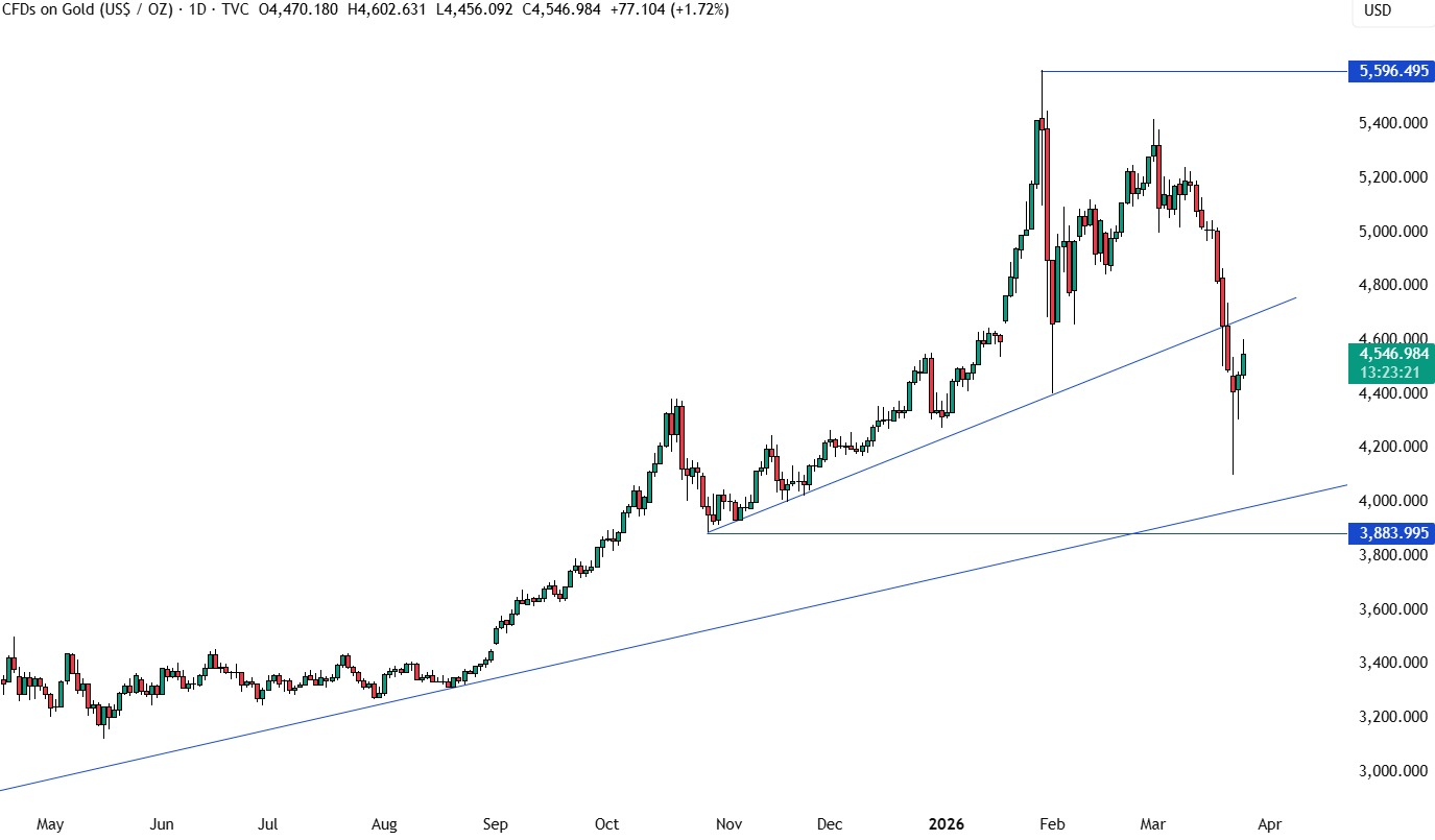截至发稿,现货黄金上涨1.6%,至4,545.34美元,盘中早些时候涨幅一度超过2%,一度突破4600美元。周一,金价曾触及四个月低点4,097.99美元。