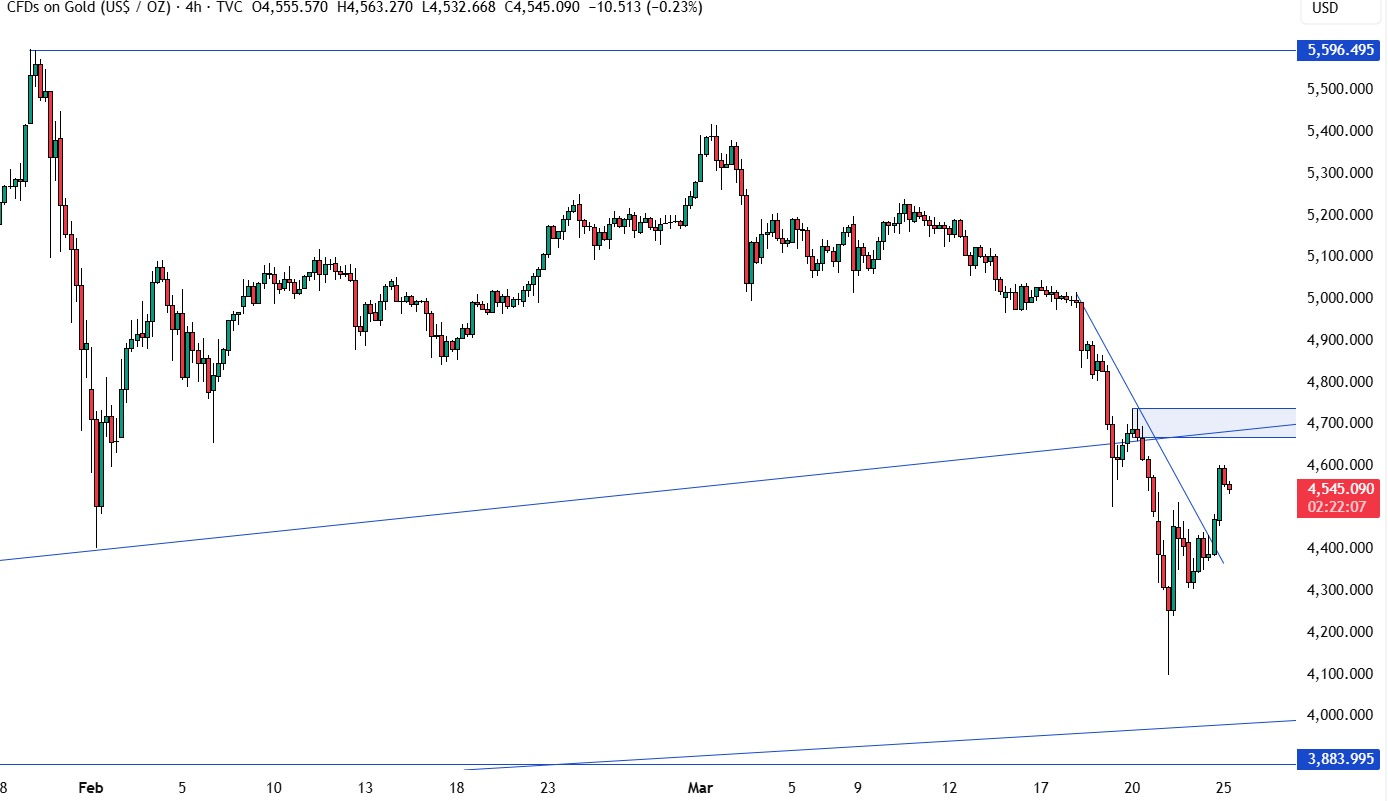 FX168财经报社(欧洲)讯 周三(3月25日)黄金延续涨势,受美元走软提振,同时油价下跌缓解了市场对通胀压力和全球利率上升的担忧。尽管美国与伊朗围绕结束战争释放出相互矛盾的信号,令投资者依然保持警惕。