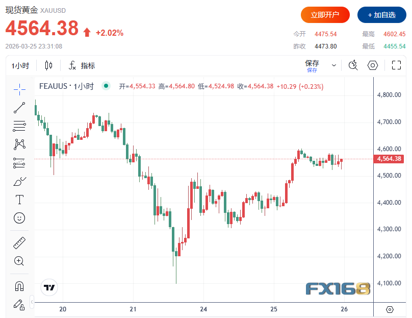 FX168财经报社(北美)讯 国际现货黄金周三(3月25日)显著反弹,此前金价在本周早些时候跌至四个月低位后,逢低买盘开始入场,推动金价连续第二个交易日回升。随着市场对美伊冲突中外交斡旋前景保持谨慎乐观,油价自高位回落,短期通胀担忧有所缓解,也为金价提供了一定支撑。