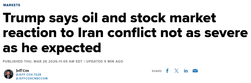 FX168财经报社(北美)讯 周四(3月26日),美国总统特朗普表示,伊朗战争对美国经济造成的冲击并没有预想中严重。无论是国际油价的上涨,还是股市的回落,在他看来都仍处于可控范围内,而且这些负面影响将在战争结束后逐步修复。