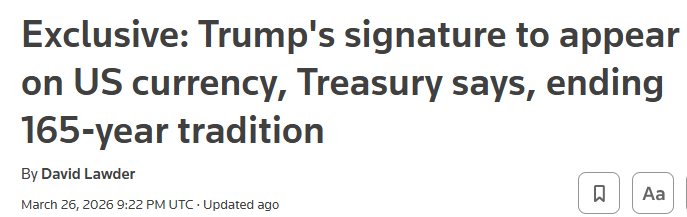FX168财经报社(北美)讯 美国财政部周四(3月26日)表示,为纪念美国独立250周年,未来发行的美元纸币将印上总统特朗普的签名。这一举措将打破自1861年以来延续165年的传统——美国纸币上将首次不再出现财政部出纳官的签名,引发市场与政策层面的广泛关注。