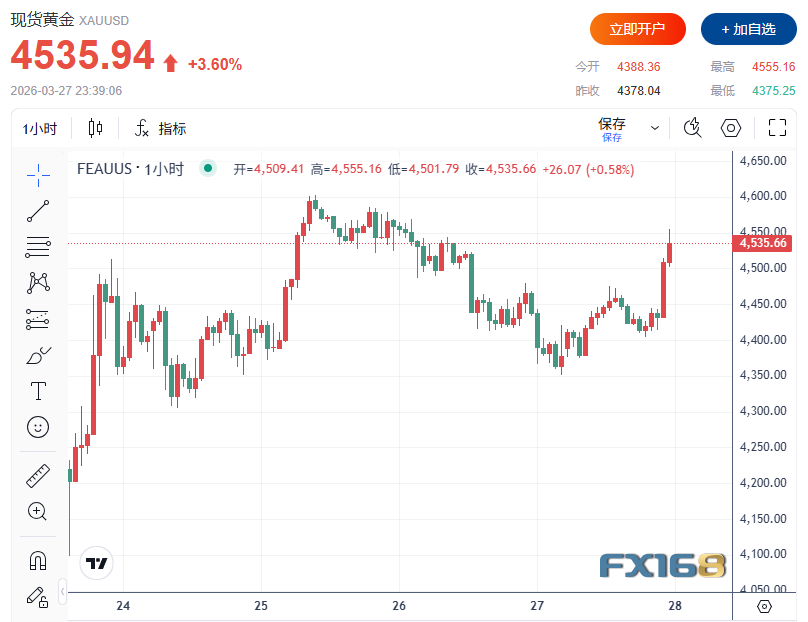 FX168财经报社(北美)讯 黄金周五(3月27日)小幅反弹,在前一交易日大跌近2.75%后暂时企稳。 随着美国、以色列与伊朗相关地缘政治消息持续变化,全球市场波动加剧,黄金走势也反复震荡。