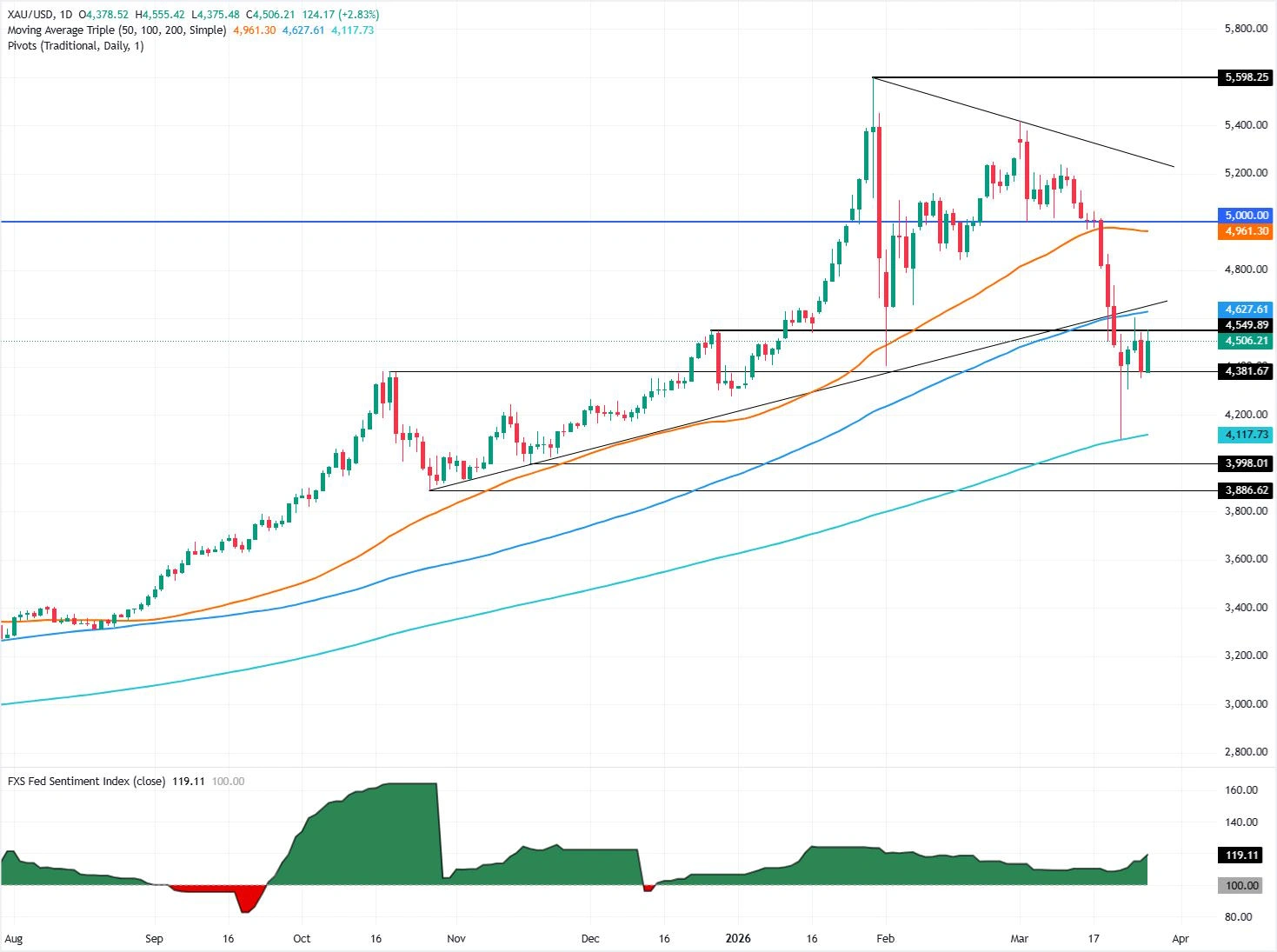 下方来看,如果黄金日线重新跌破4500美元,则下一支撑位将指向3月24日低点4306美元,随后是3月23日低点4098美元。这意味着,4500美元一线正在成为短期多空争夺的重要分水岭。
