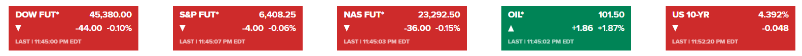 道琼斯工业平均指数期货周日晚间下跌逾200点,跌幅0.5%。标普500指数期货下跌0.5%,纳斯达克100指数期货下跌约0.6%。与此同时,美国WTI原油价格一度飙升逾3%,最新交投在每桶103美元附近。全球基准布伦特原油价格也上涨约3%。