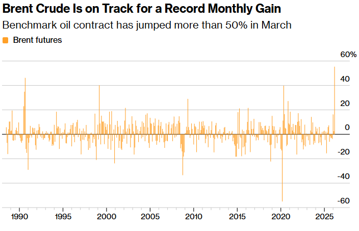 布伦特原油上涨2.6%,至每桶115.45美元,月内累计涨幅接近60%;WTI上涨1.3%,至每桶100.98美元。市场观察人士表示,这场冲突几乎看不到降级迹象,关注点正转向替代石油出口通道的脆弱性。