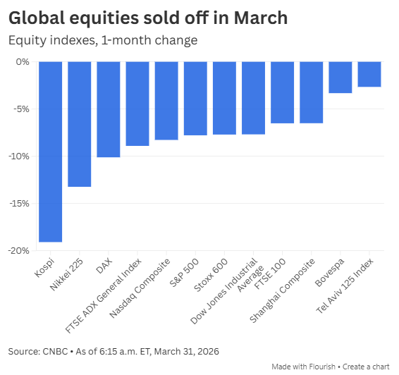 股市:全球普跌,能源冲击拖累市场情绪在股市方面,全球主要市场普遍承压。华尔街三大股指均以月度下跌收官,而欧洲和亚洲市场受冲击更为明显。