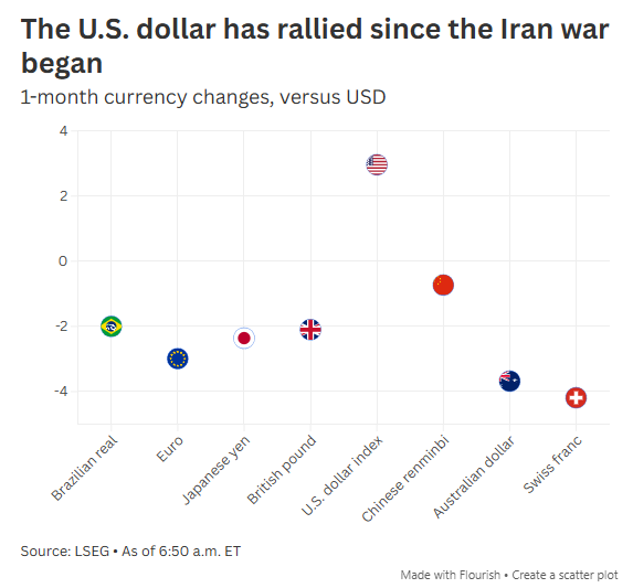 分析认为,能源驱动的滞胀风险短期内支撑美元表现,而欧洲和亚洲货币则因能源成本上升而承压。类似情形曾在俄乌冲突期间出现,当时美元同样成为主要受益资产。