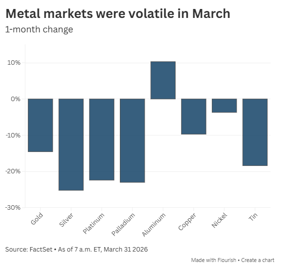 金属:黄金剧烈波动,短期承压但长期仍被看好金属市场同样经历剧烈波动。黄金作为传统避险资产,本应在动荡中受益,但却出现明显回调,正迈向自2008年以来最差月度表现。