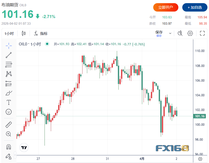 截至撰稿,布伦特原油期货下跌2.23%,报101.65美元/桶;美国WTI原油期货下跌2.19%,报99.16美元/桶。