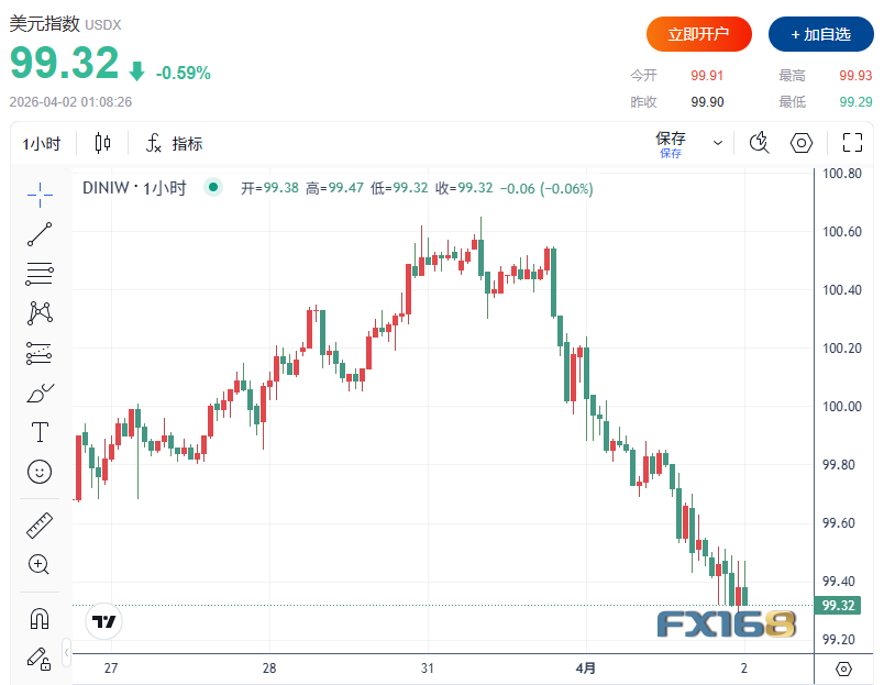 美元指数下跌0.6%至99.30一线,延续前一交易日创下的两周来最大单日跌幅。欧元则接近三周高位,反映出市场避险需求有所缓解。