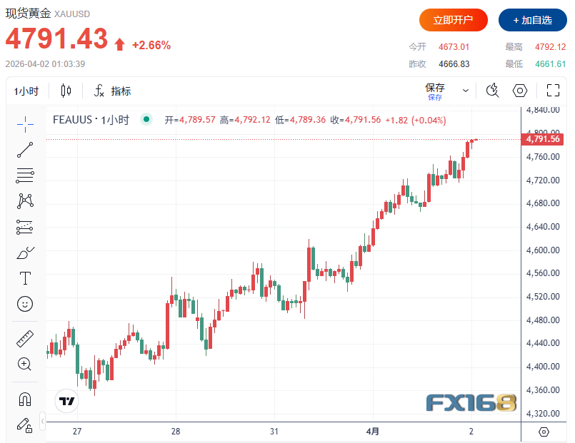 黄金四连涨 资金继续流向贵金属周三,黄金价格连续第四个交易日上涨,并升至接近两周高位的水平。现货黄金触及3月19日以来最高水平,上涨近2.7%至4792.12美元/盎司。