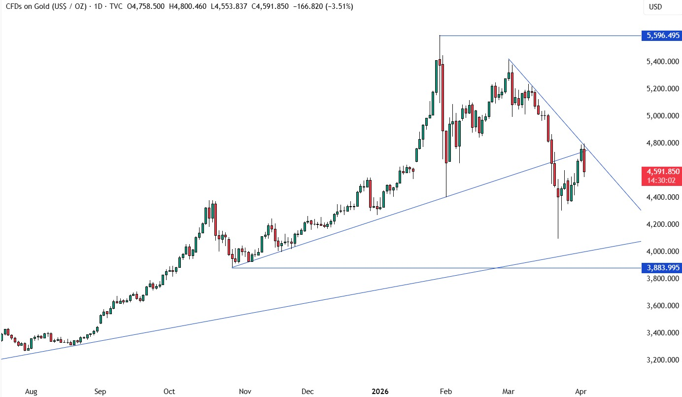 在日线图上可以看到,黄金在“已跌破的上升趋势线”和“下降趋势线”形成的共振区域附近遭遇阻力回落。卖方在该区域入场,上方风险控制位设在下降趋势线之上,目标是推动金价下跌至4000水平。买方则需要看到价格向上突破,才会进一步加大押注,目标看向5000水平。