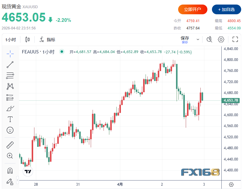 美市盘中,现货黄金交投于4650美元一线,日内稍早一度跌至4554.09美元低点,当日下跌近4%,较此前接近4800美元的两周高位明显回落。