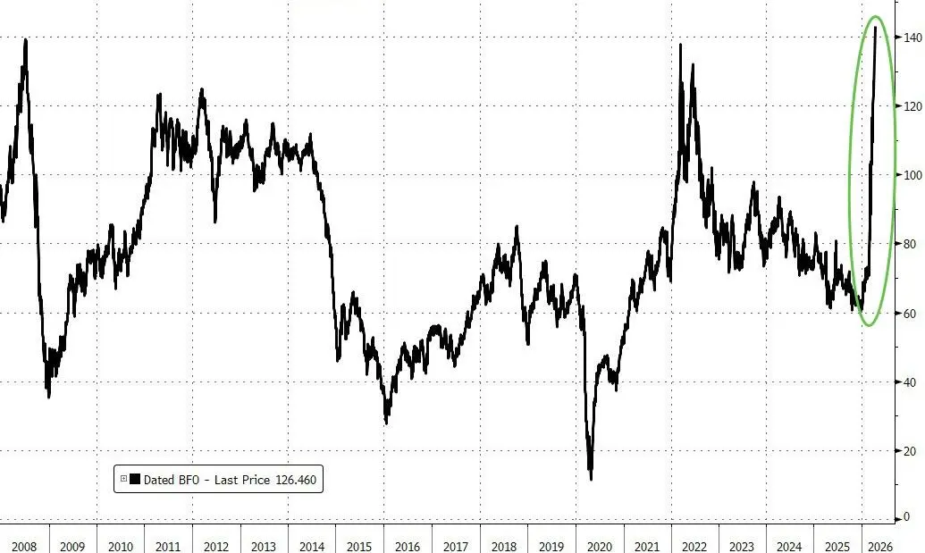 所谓现货价格,反映的是未来10至30天内交付的布伦特原油船货需求。当前这一价格大幅上冲,凸显出在伊朗关闭霍尔木兹海峡之后,全球原油实货供应正面临极度紧张局面。