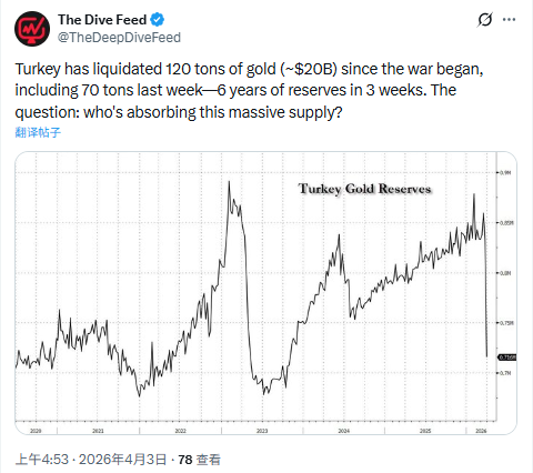 FX168财经报社(北美)讯 在伊朗战争持续冲击全球市场、推高能源价格之际,土耳其央行正以前所未有的速度动用黄金储备稳定本国金融体系。最新数据显示,该行上周黄金储备减少69.1吨,降至702.5吨,创下至少2013年有记录以来最大单周跌幅;过去两周累计降幅已超过118吨,凸显出土耳其在汇率与流动性压力下所面临的严峻局面。
