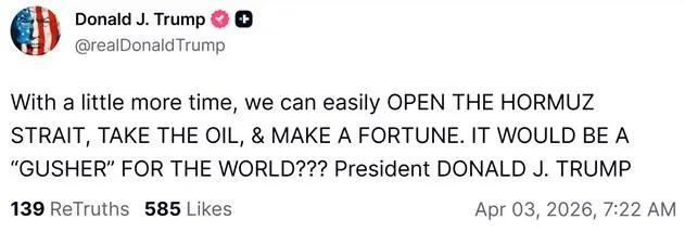 他在周五的一则社交媒体帖文中写道:“只要再给一点时间,我们就可以轻松打开霍尔木兹海峡,拿下石油,并赚一大笔钱。”