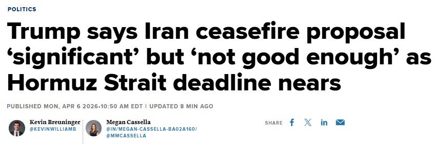 FX168财经报社(北美)讯 美国总统特朗普周一(4月6日)表示,伊朗方面针对美国提出的停火安排所给出的最新方案“具有重大意义”,但“还不够好”。