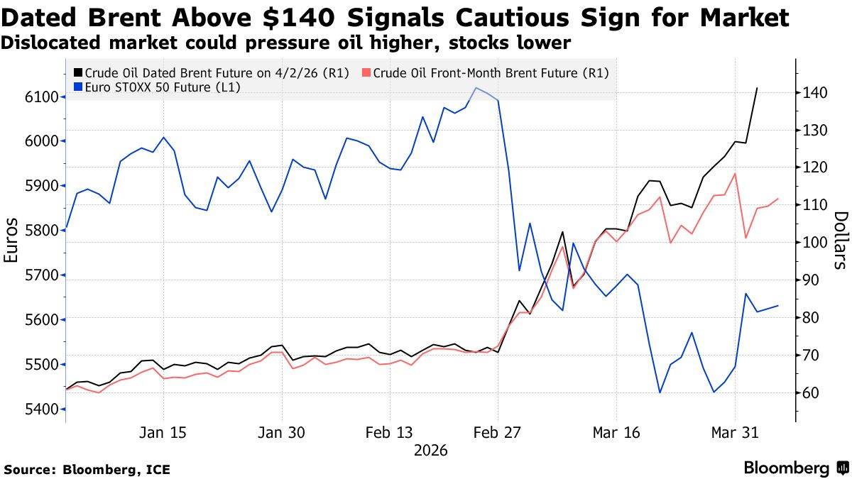 石油市场不断上升的紧张情绪,正体现在现货原油的高额溢价之中。复活节假期前,“即期布伦特”价格一度飙升至每桶140美元上方,创下2008年以来最高水平。