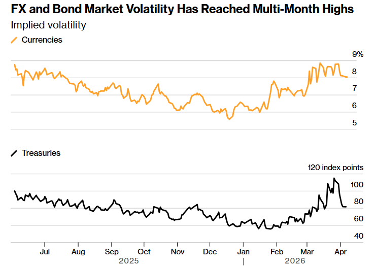 (外汇和债券市场波动率已升至数月高位 来源:彭博、摩根大通、Intercontinental Exchange)